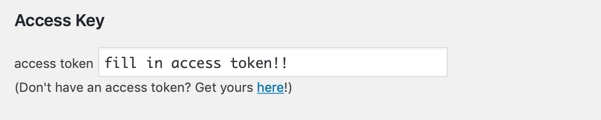 After you signed up with us you can create an Access Token also known as an Access Key. After you have created this key it needs to be copied into the field below.