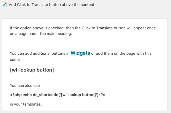 The next option Enable Click to Translate functionality on website / page enables our Click to Translate API by default if this option is checked. If this option is not checked your users will first have to click on our Click to Translate Button that is displayed on every blog.