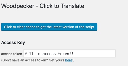 When using our Click to Translate API with WordPress simply install our Click to Translate Plugin from the WordPress store. Go to the settings page the Click to Translate plugin and copy the API Key into the field that says: “fill in access token!!”.